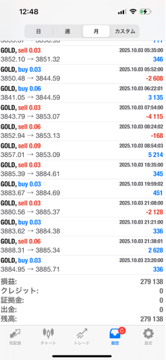100万円運用、ゴールドで+279,138円。月利は27.9%でした。